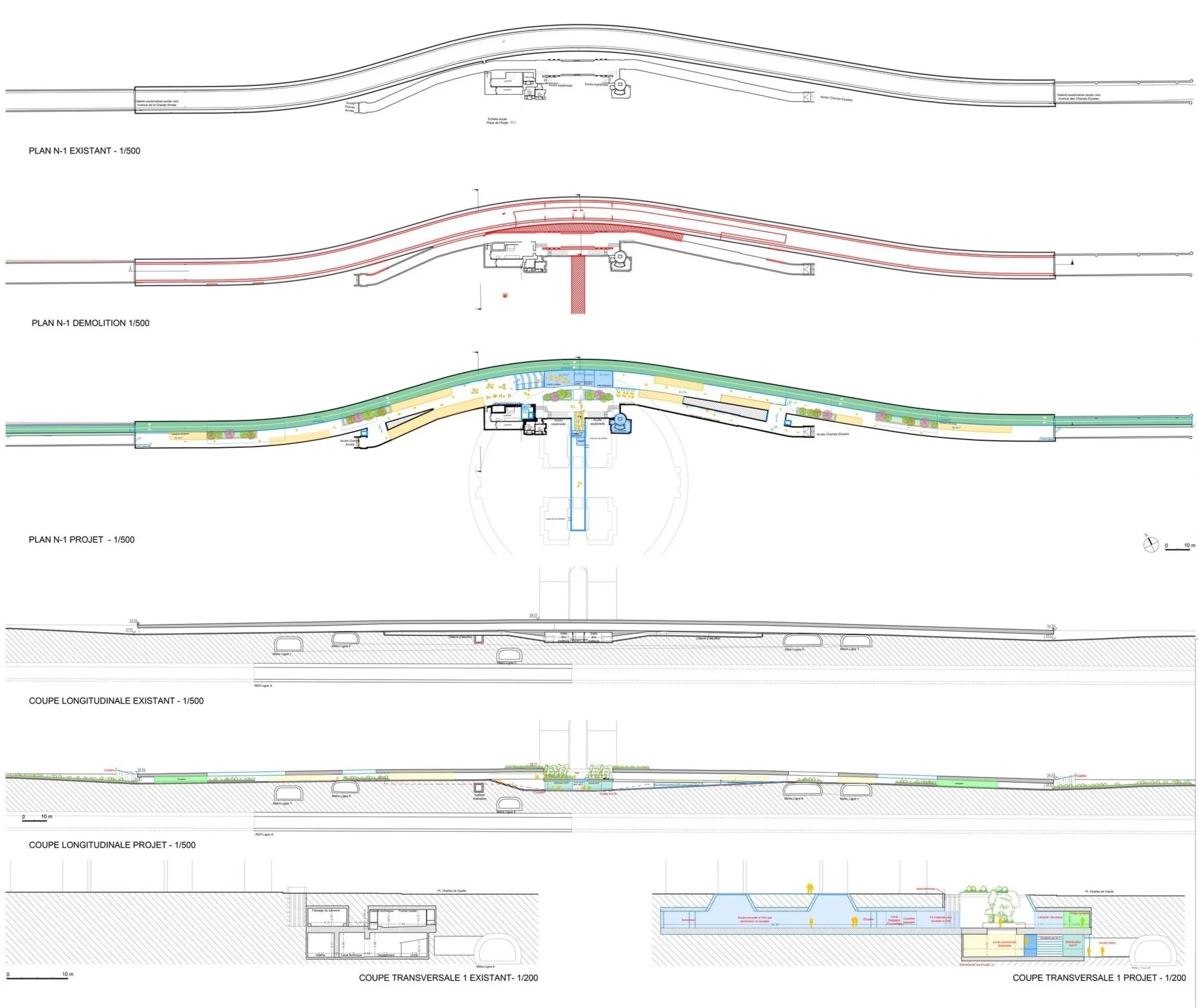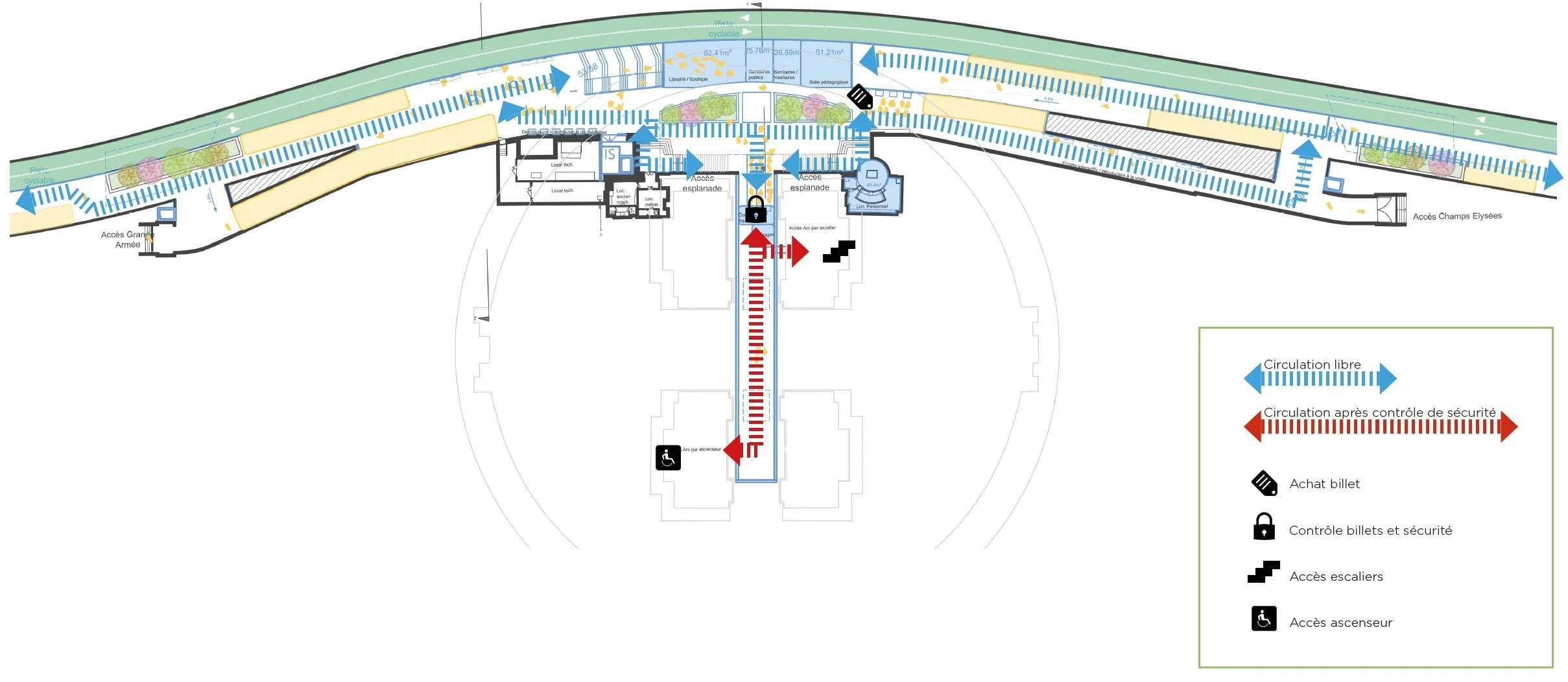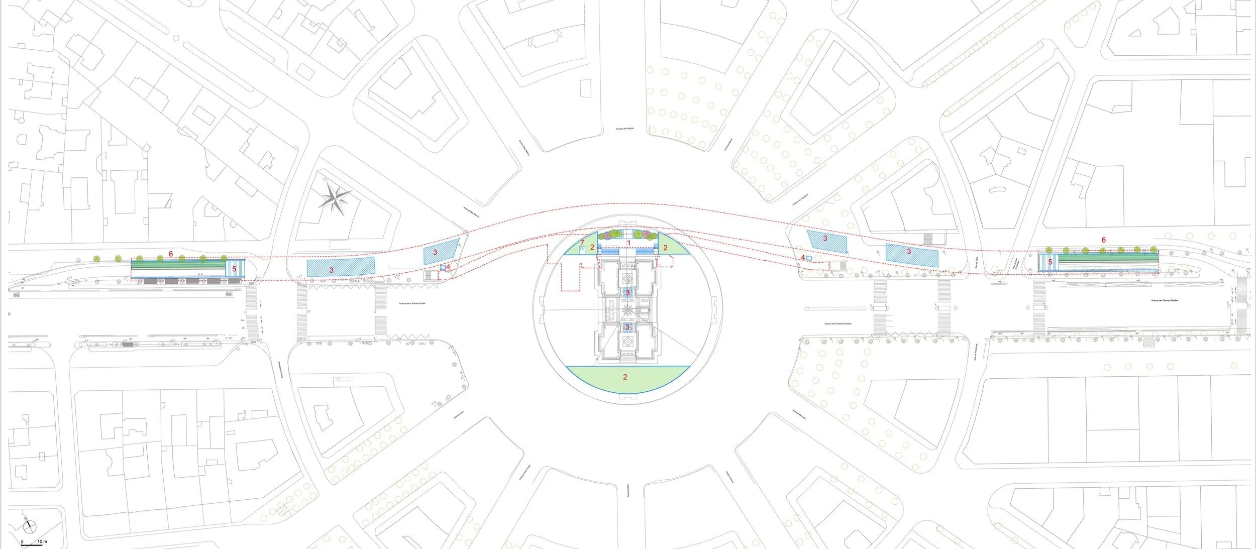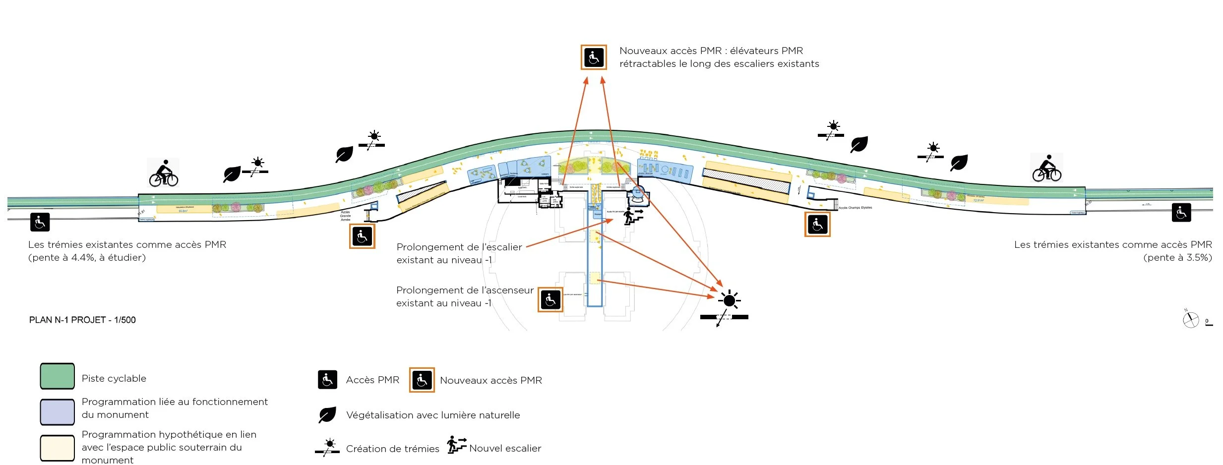 Le projet vise à requalifier la traversée en offrant des liaisons piétonnes qualitatives et un accès sécurisé au monument pour les personnes à mobilité réduite. Il propose une ouverture vers l’extérieur, en créant des polarités et des interactions tout au long du parcours entre la ville et le souterrain. Pensé selon une logique de flux, le tunnel accueille à la fois des usages dynamiques et statiques, articulés autour d’un fil conducteur spatial qui accompagne les circulations, s’adapte aux usages et met en tension les différents espaces. Des zones végétalisées viennent transfigurer cet espace minéral, apportant fraîcheur, vie et renouvellement à l’imaginaire collectif.